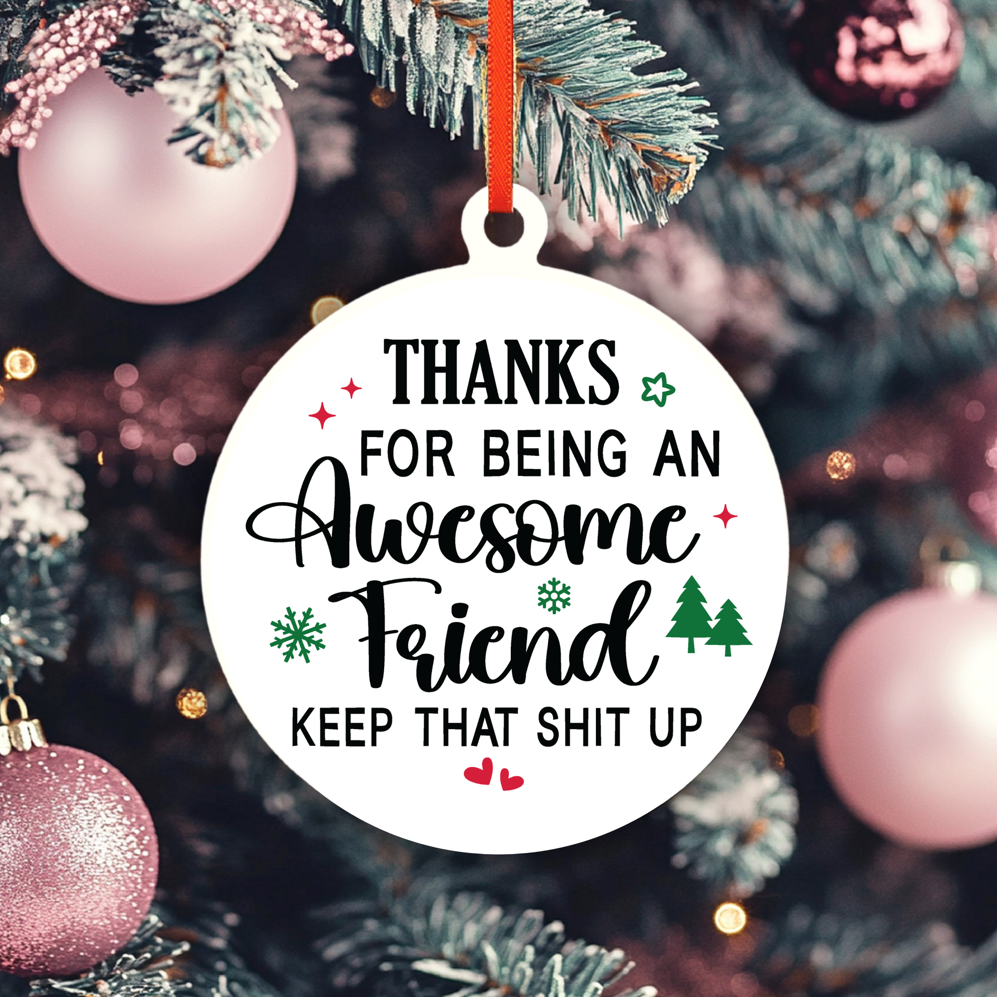 Show your appreciation for your friend with our Awesome Friend Ornament. Spread love and gratitude with our quirky and playful design. Keep the good vibes going, and make your friend smile every day (while secretly cursing).